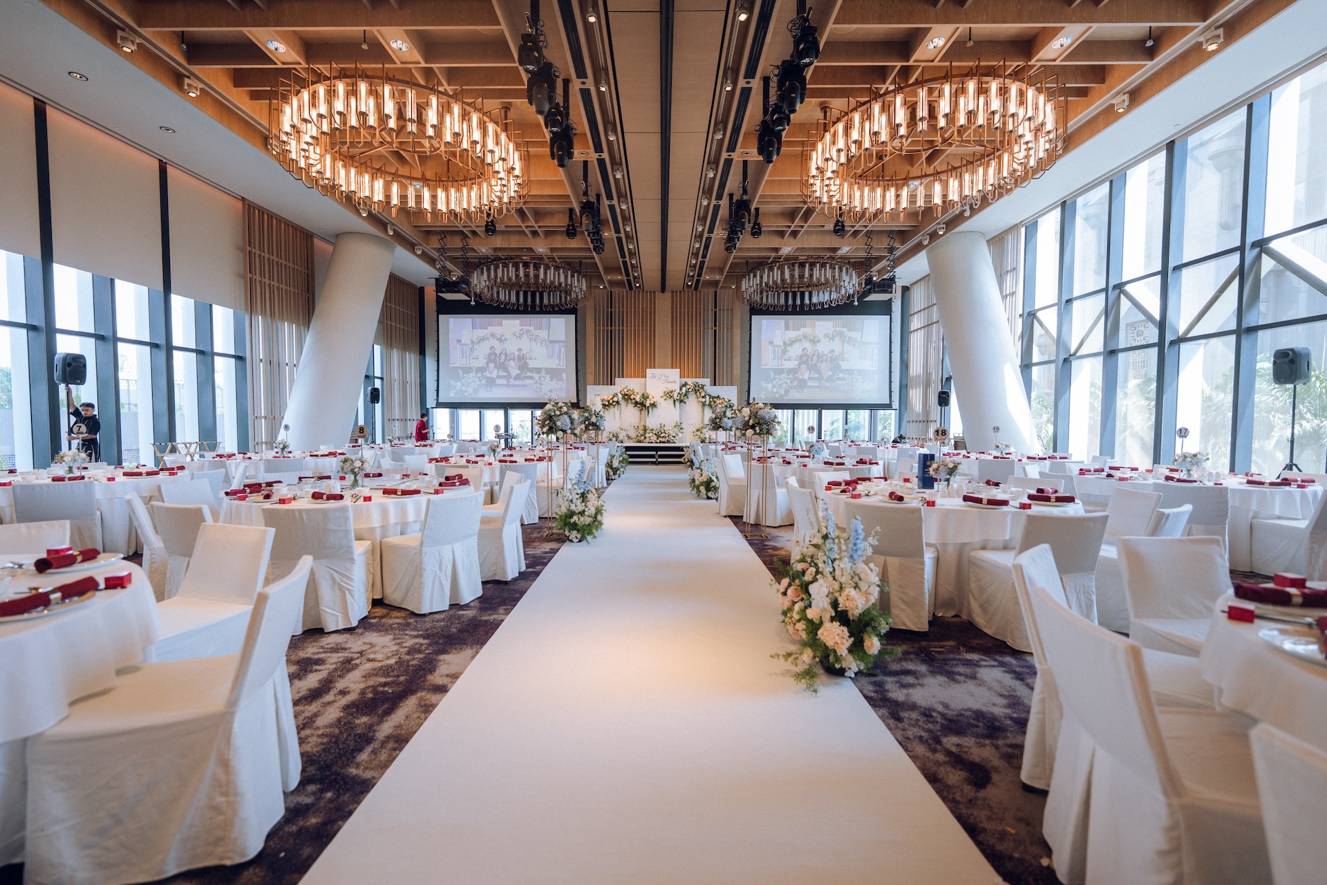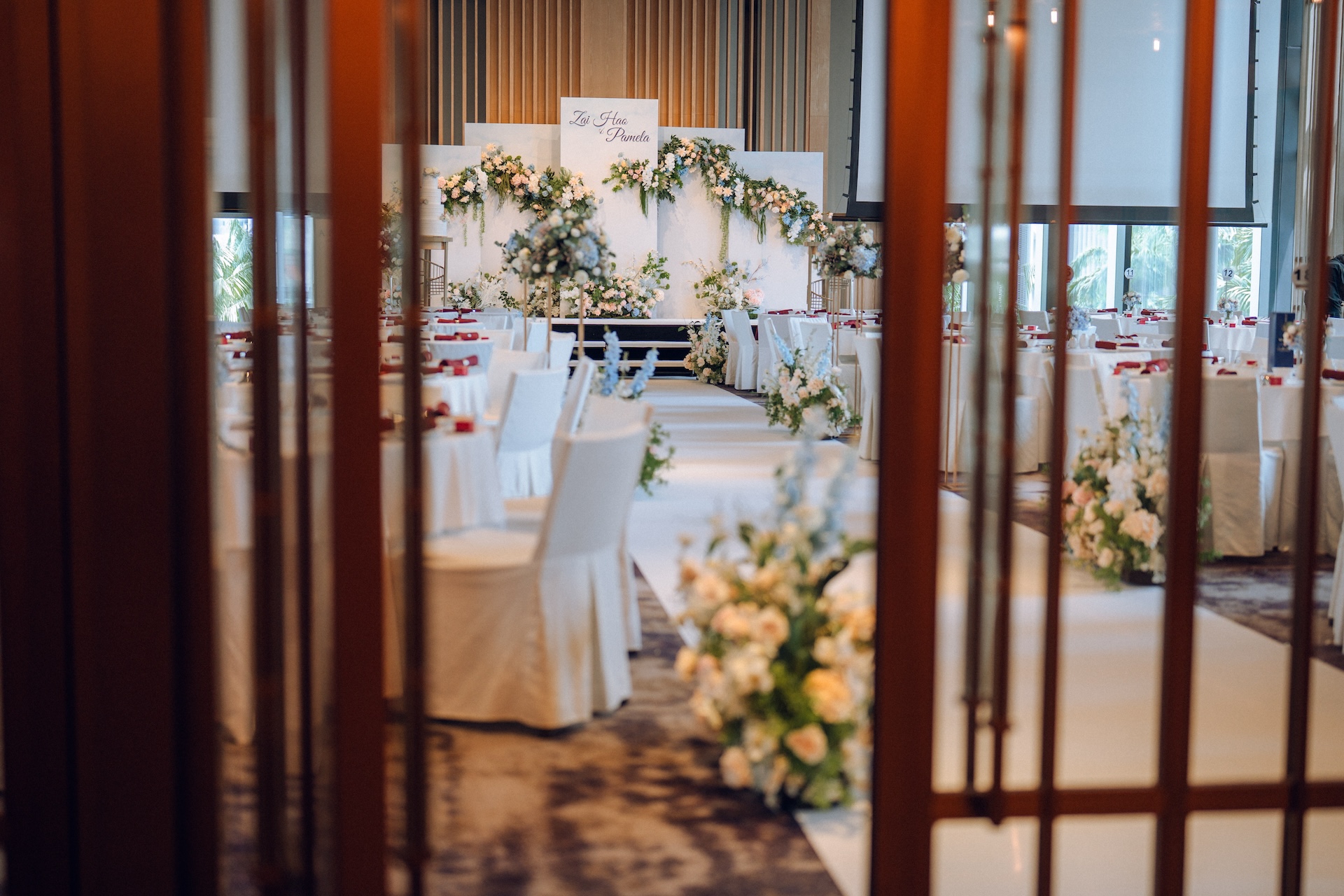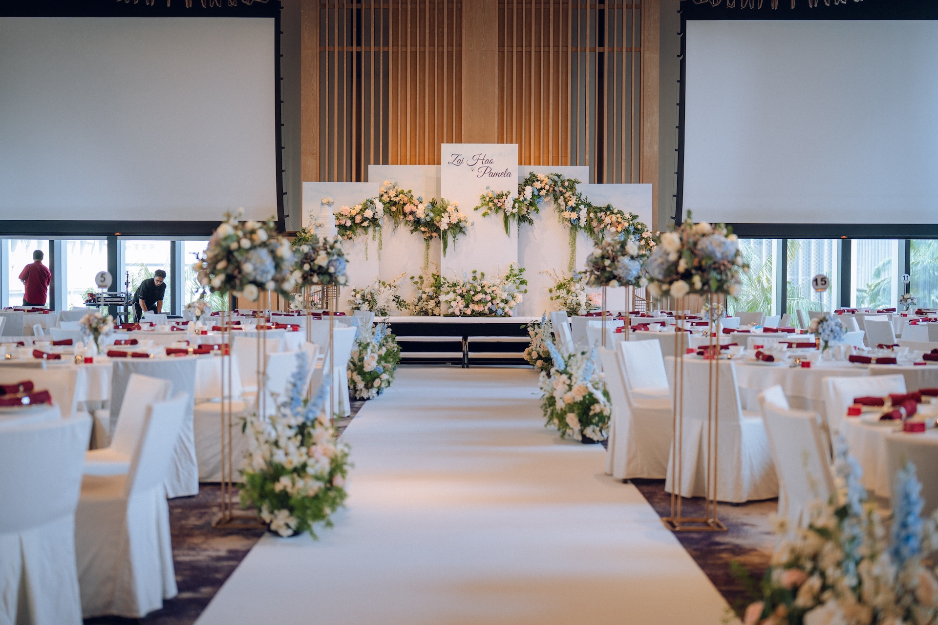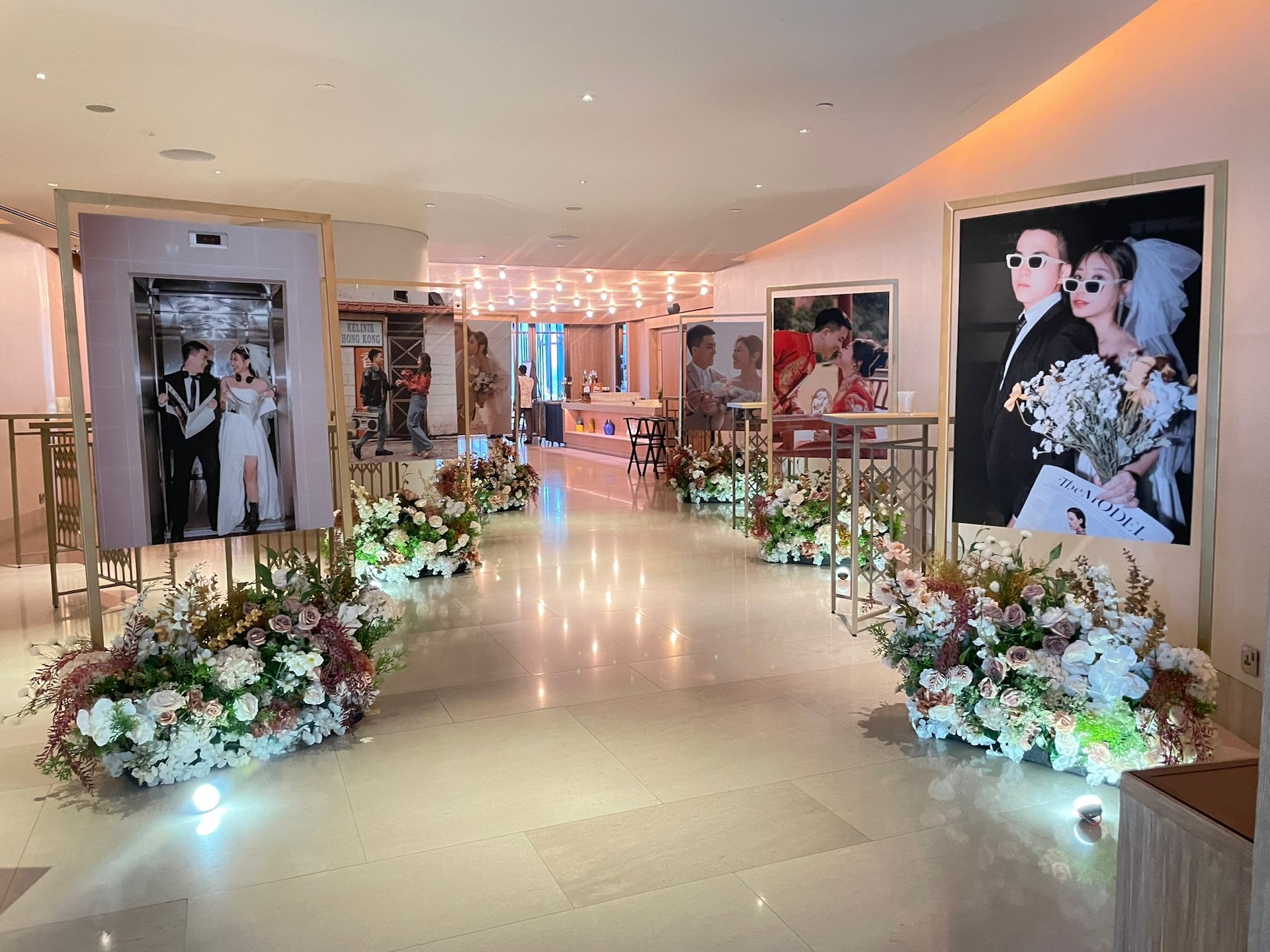 In Ms Mary Golez’s TikTok video, a red carpet along with an art deco backdrop can be seen, allowing for guests to pose for photos at the entrance. Guests then walk down a colourful floral-lined aisle to enter the venue.